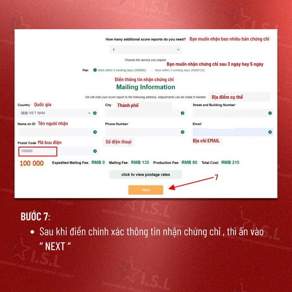 BƯỚC 7: Sau khi điền chính xác thông tin nhận chứng chỉ , thì ấn vào “ NEXT